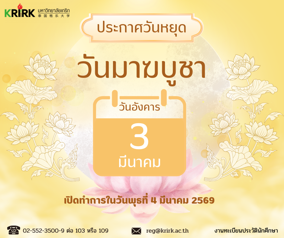 ฝ่ายทะเบียนและวัดผล Registration Office ประกาศ ประกาศวันหยุดเนื่องในวันมาฆบูชา February 27, 2569 ประกาศปิดทำการ February 5, 2569 ประกาศวันหยุดสิ้นปี December 23, 2568 ดูทั้งหมด คู่มือนักศึกษา ปฏิทินการศึกษา ตารางเรียน / ตารางสอบ คำร้องขอต่าง ๆ สถิติ / สารสนเทศ แจ้งจบการศึกษา ตรวจสอบผู้สำเร็จการศึกษา กิจกรรม การศึกษาดูงานของคณะผู้บริหารมหาวิทยาลัยเกริก เรื่อง การเตรียมความพร้อมเข้าสู่ประชาคมอาเซียน การเสวนา เรื่อง การเข้าสู่ตำแหน่งทางวิชาการ : ระเบียบ ขั้นตอน วิธีการ การอบรมเชิงปฏิบัติการ เรื่อง เทคนิคการวิจัยในชั้นเรียน สัมมนา เรื่อง การสร้างแรงบัลดาลใจในการทำงานร่วมกันอย่างทรงพลัง ข่าวสารประชาสัมพันธ์ ประกาศ! การลงทะเบียน ประจำภาคฤดูร้อน 2567 February 3, 2568 สมัครเรียน2566 February 17, 2566 ประกาศ! การลงทะเบียนออนไลน์ของภาคพิเศษ เรียนวันเสาร์-อาทิตย์ ลงทะเบียนออนไลน์ ภาคฤดูร้อน 2565 ตั้งแต่วันที่ 18-26 ก.พ. 2566 ลงทะเบียนออนไลน์ผ่าน KRIRK SMART APP February 10, 2566 กำหนดการลงทะเบียนเรียน ภาคฤดูร้อน ปีการศึกษา 2565 ออนไลน์ผ่าน Krirk Smart App 30 ม.ค. – 3 ก.พ. 2566 January 27, 2566 ดูทั้งหมด