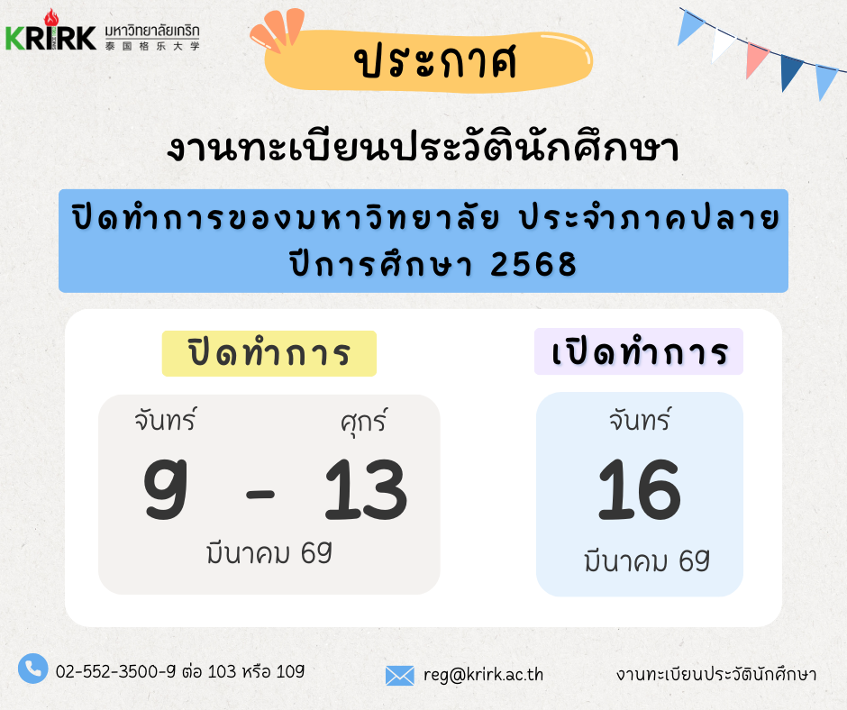 ฝ่ายทะเบียนและวัดผล Registration Office ประกาศ ประกาศปิดทำการของมหาวิทยาลัย ประจำภาคปลาย ปีการศึกษา 2568 March 4, 2569 ประกาศวันหยุดเนื่องในวันมาฆบูชา February 27, 2569 ประกาศปิดทำการ February 5, 2569 ดูทั้งหมด คู่มือนักศึกษา ปฏิทินการศึกษา ตารางเรียน / ตารางสอบ คำร้องขอต่าง ๆ สถิติ / สารสนเทศ แจ้งจบการศึกษา ตรวจสอบผู้สำเร็จการศึกษา กิจกรรม การศึกษาดูงานของคณะผู้บริหารมหาวิทยาลัยเกริก เรื่อง การเตรียมความพร้อมเข้าสู่ประชาคมอาเซียน การเสวนา เรื่อง การเข้าสู่ตำแหน่งทางวิชาการ : ระเบียบ ขั้นตอน วิธีการ การอบรมเชิงปฏิบัติการ เรื่อง เทคนิคการวิจัยในชั้นเรียน สัมมนา เรื่อง การสร้างแรงบัลดาลใจในการทำงานร่วมกันอย่างทรงพลัง ข่าวสารประชาสัมพันธ์ ประกาศ! การลงทะเบียน ประจำภาคฤดูร้อน 2567 February 3, 2568 สมัครเรียน2566 February 17, 2566 ประกาศ! การลงทะเบียนออนไลน์ของภาคพิเศษ เรียนวันเสาร์-อาทิตย์ ลงทะเบียนออนไลน์ ภาคฤดูร้อน 2565 ตั้งแต่วันที่ 18-26 ก.พ. 2566 ลงทะเบียนออนไลน์ผ่าน KRIRK SMART APP February 10, 2566 กำหนดการลงทะเบียนเรียน ภาคฤดูร้อน ปีการศึกษา 2565 ออนไลน์ผ่าน Krirk Smart App 30 ม.ค. – 3 ก.พ. 2566 January 27, 2566 ดูทั้งหมด