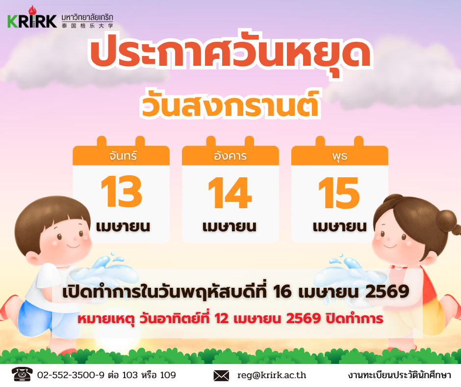 ฝ่ายทะเบียนและวัดผล Registration Office ประกาศ ประกาศวันหยุด เนื่องในวันสงกรานต์ April 7, 2569 ประกาศวันหยุด เนื่องในวันจักรี April 2, 2569 ประกาศปิดทำการของมหาวิทยาลัย ประจำภาคปลาย ปีการศึกษา 2568 March 4, 2569 ดูทั้งหมด คู่มือนักศึกษา ปฏิทินการศึกษา ตารางเรียน / ตารางสอบ คำร้องขอต่าง ๆ สถิติ / สารสนเทศ แจ้งจบการศึกษา ตรวจสอบผู้สำเร็จการศึกษา กิจกรรม การศึกษาดูงานของคณะผู้บริหารมหาวิทยาลัยเกริก เรื่อง การเตรียมความพร้อมเข้าสู่ประชาคมอาเซียน การเสวนา เรื่อง การเข้าสู่ตำแหน่งทางวิชาการ : ระเบียบ ขั้นตอน วิธีการ การอบรมเชิงปฏิบัติการ เรื่อง เทคนิคการวิจัยในชั้นเรียน สัมมนา เรื่อง การสร้างแรงบัลดาลใจในการทำงานร่วมกันอย่างทรงพลัง ข่าวสารประชาสัมพันธ์ ประกาศ! การลงทะเบียน ประจำภาคฤดูร้อน 2567 February 3, 2568 สมัครเรียน2566 February 17, 2566 ประกาศ! การลงทะเบียนออนไลน์ของภาคพิเศษ เรียนวันเสาร์-อาทิตย์ ลงทะเบียนออนไลน์ ภาคฤดูร้อน 2565 ตั้งแต่วันที่ 18-26 ก.พ. 2566 ลงทะเบียนออนไลน์ผ่าน KRIRK SMART APP February 10, 2566 กำหนดการลงทะเบียนเรียน ภาคฤดูร้อน ปีการศึกษา 2565 ออนไลน์ผ่าน Krirk Smart App 30 ม.ค. – 3 ก.พ. 2566 January 27, 2566 ดูทั้งหมด